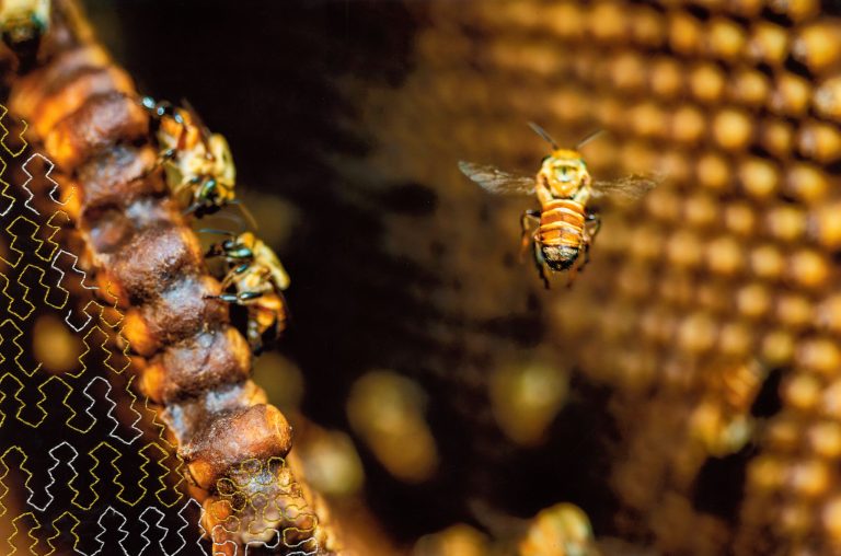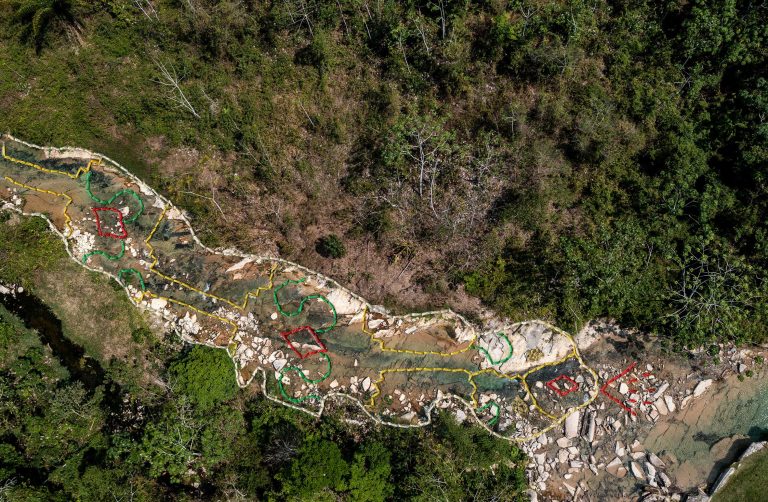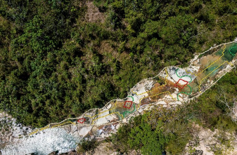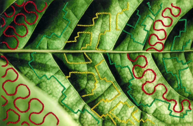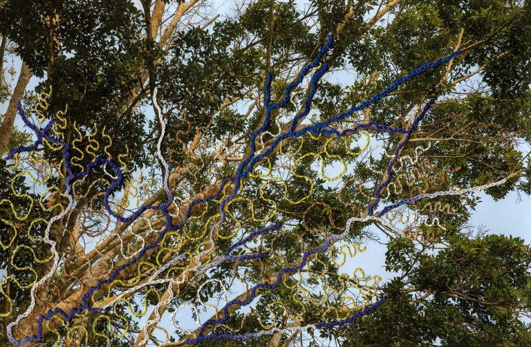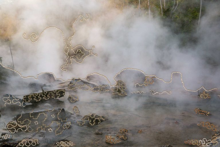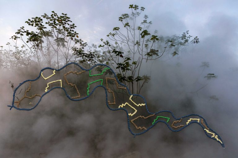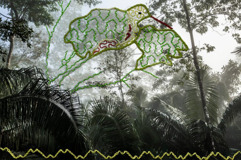 In them, I showcase elements of Amazonia using photography, while Sadith reveals the immaterial energy that flows across the jungle using kené embroidery. Kené, the visual language of the Shipibo people, represents the invisible energy of their universe. In a transition from the invisible world to the visible and back to the invisible, this series develops a dialogue about the Amazonian multiverse. The resulting series is a visual encounter between two languages that capture light through different means: photography and embroidery.